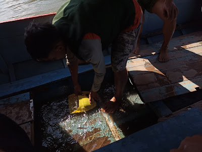 Une fois nos vélos chargés, relativement bien .. au tour de nos sacs. 23 passagers ont déjà pris place et leurs bagages également. Il ne nous reste plus qu'un banc derrière le pilote, pour pouvoir nous asseoir, avec une troisième personne. Nous ferons le voyage en marche arrière. Quant à nos sacoches, elles sont réparties un peu partout.